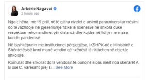 Ministrja e Arsimit, Arbërie Nagavci bën të ditur se nga e hëna, me 19 prill, në të gjitha nivelet e arsimit parauniversitar mësimi do të vazhdojë me pjesëmarrje fizike të nxënësve në shkolla duke respektuar rekomandimet për distancë dhe kujdes në lidhje me masat kundër pandemisë.
