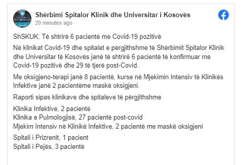 Në klinikat Covid-19 dhe spitalet e përgjithshme të Shërbimit Spitalor Klinik dhe Universitar të Kosovës janë të shtrirë 6 pacientë të konfirmuar me Covid-19 pozitivë dhe 29 të tjerë post-Covid.