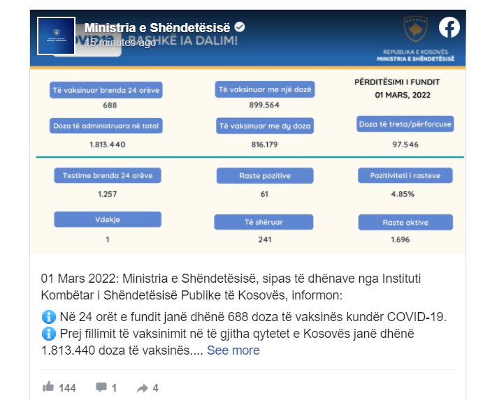 Instituti Kombëtar i Shëndetësisë së Kosovës përmes postimit në rrjetin social Facebook, ka publikuar rastet e të infektuarve me COVID-19, më 01.03.2022
