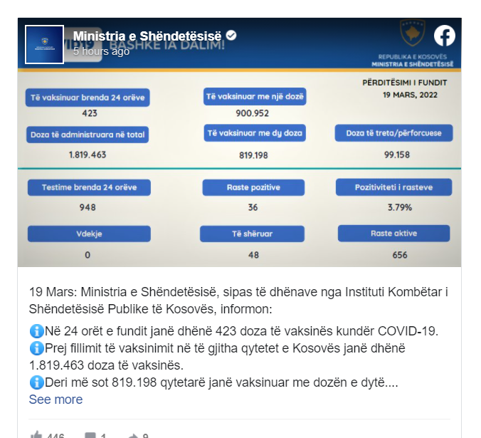Instituti Kombëtar i Shëndetësisë së Kosovës përmes postimit në rrjetin social Facebook, ka publikuar rastet e të infektuarve me COVID-19, më 19.03.2022