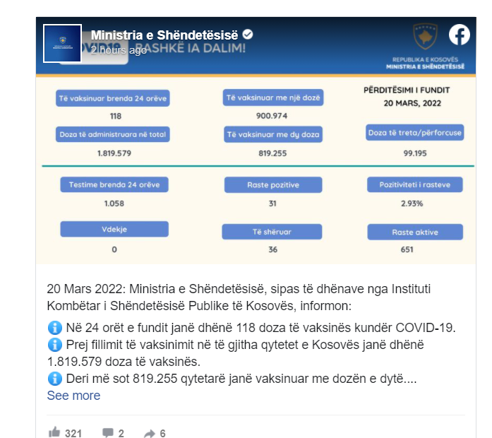 Instituti Kombëtar i Shëndetësisë së Kosovës përmes postimit në rrjetin social Facebook, ka publikuar rastet e të infektuarve me COVID-19, më 20.03.2022.