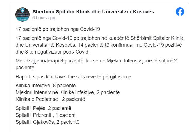 Në kuadër të Shërbimit Spitalor Klinik dhe Universitar të Kosovës po trajtohen17 pacientë nga Covid-19, 14 pacientë të konfirmuar me Covid-19 pozitiv dhe 3 të negativizuar post- Covid.
