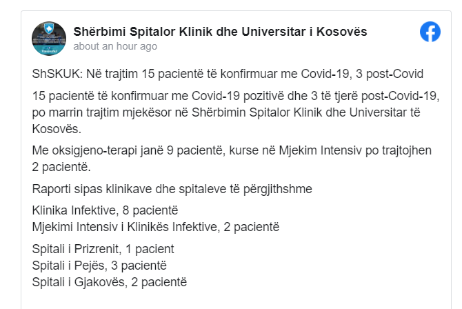 Në Shërbimin Spitalor Klinik dhe Universitar të Kosovës po marrin trajtim mjekësor 15 pacientë të konfirmuar me Covid-19 pozitivë dhe 3 të tjerë post-Covid-19.