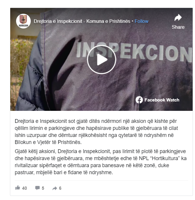 Komuna e Prishtinës ka bërë të ditur se Drejtoria e Inspekcionit sot gjatë ditës ndërmori një aksion që kishte për qëllim lirimin e parkingjeve dhe hapësirave publike të gjelbëruara të cilat ishin uzurpuar dhe dëmtuar njëkohësisht nga qytetarë të ndryshëm në Bllokun e Vjetër të Prishtinës.