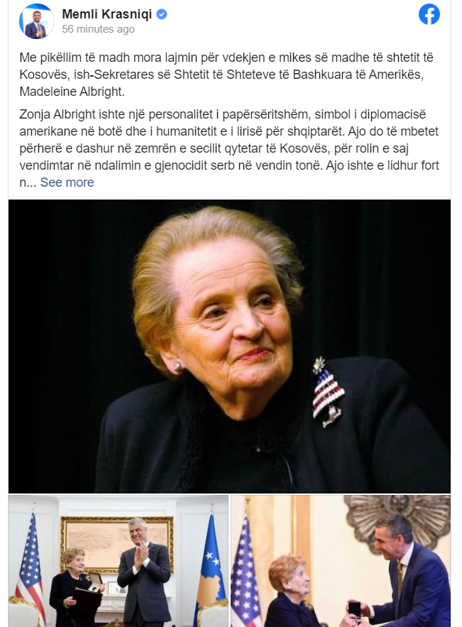 Krasniqi në postimin e tij në Facebook ka thënë se Zonja Albright ishte një personalitet i papërsëritshëm, simbol i diplomacisë amerikane në botë dhe i humanitetit e i lirisë për shqiptarët, prandaj unë dhe Partia Demokratike e Kosovës bashkëndjejmë me dhembjen e popullit amerikan dhe të familjes së saj.