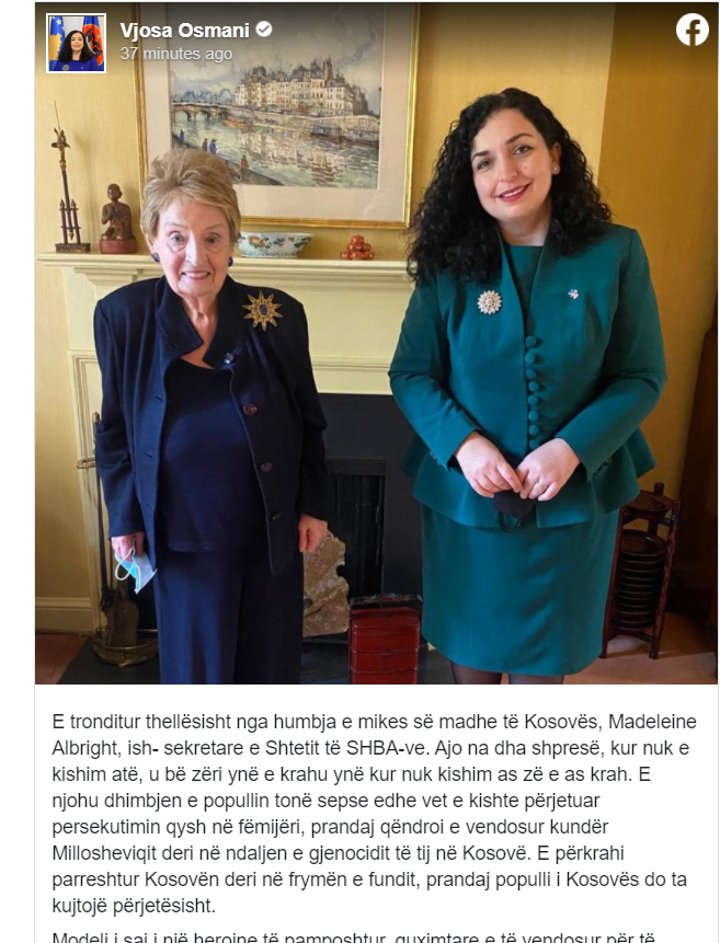 Presidentja e Kosovës. Vjosa Osmani pas lajmit të humbjes së mikes së madhe të Kosovës, Madeleine Albright është shprehur e tronditur duke thënë se e njohu dhimbjen e popullin tonë sepse edhe vet e kishte përjetuar persekutimin qysh në fëmijëri, prandaj qëndroi e vendosur kundër Millosheviqit deri në ndaljen e gjenocidit të tij në Kosovë.