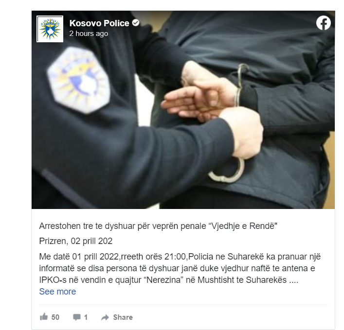 Personat e dyshuar janë shoqëruar ne stacioni policor ,janë intervistuar dhe në konsultim me Prokurorinë kujdestar nafta iu është kthyer pronarit, kurse të dyshuarit janë ndalur në Qendrën e Mbajtjes për dyzetetetë (48) orë. Rasti është duke u hetuar, thuhet në postimin në Facebook të PK-së.