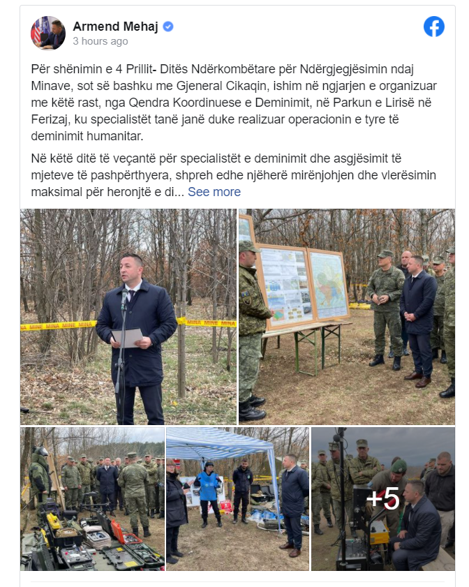 Mehaj në postimin e tij në Facebook ka thënë se në këtë ditë të veçantë për specialistët e deminimit dhe asgjësimit të mjeteve të pashpërthyera, shpreh edhe njëherë mirënjohjen dhe vlerësimin maksimal për heronjtë e ditëve tona, për 21 vjet detektuan dhe shkatërruan mbi 100 mijë mina e mjete tjera të rrezikshme, pastruan mbi 60 milionë m2 terren të afektuar nga minat në afro 4500 pika të rrezikshme.