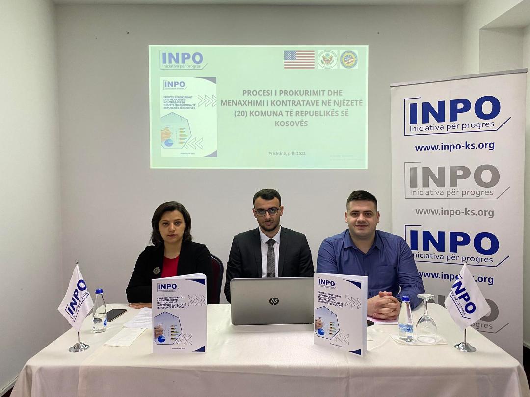 Organizata Iniciativa për Progres (INPO), në kuadër të projektit “Kërko Drejtësi: Fuqizimi i qasjes në drejtësi në Kosovë”, me mbështetje të Departamentit të Shtetit Amerikan – Byrosë Ndërkombëtare për Çështje të Narkotikëve dhe Zbatimit të Ligjit (INL), sot nëpërmjet konferencës për media ka publikuar raportin me titull “Procesi i prokurimit dhe menaxhimi i kontratave në njëzetë (20) komuna të Republikës së Kosovës”.
