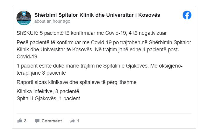 Spitali i Gjakovës, 1 pacient, thuhet në postimin në Facebook të ShSKUK-së.