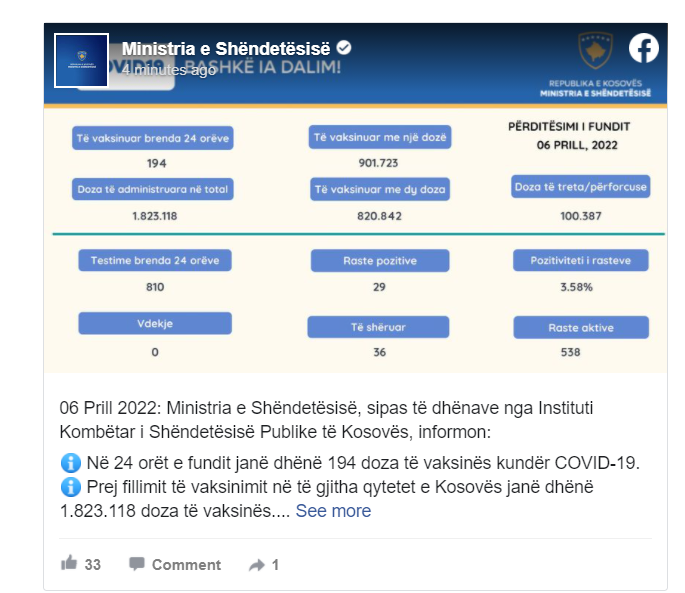 Instituti Kombëtar i Shëndetësisë së Kosovës përmes postimit në rrjetin social Facebook, ka publikuar rastet e të infektuarve me COVID-19, më 06.04.2022.