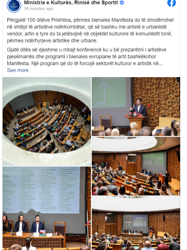 Ministria e Kulturës Rinisë dhe Sportit njofton se është mbajt konferencë ku është bë prezantimi i artistëve pjesëmarrës dhe programi i bienales evropiane të artit bashkëkohor Manifesta. Një program që do të forcojë sektorët kulturor e artistik në Prishtinë ndërsa e vendos Kosovën në hartën e organizimeve kulturore më të mëdha në Evropë.