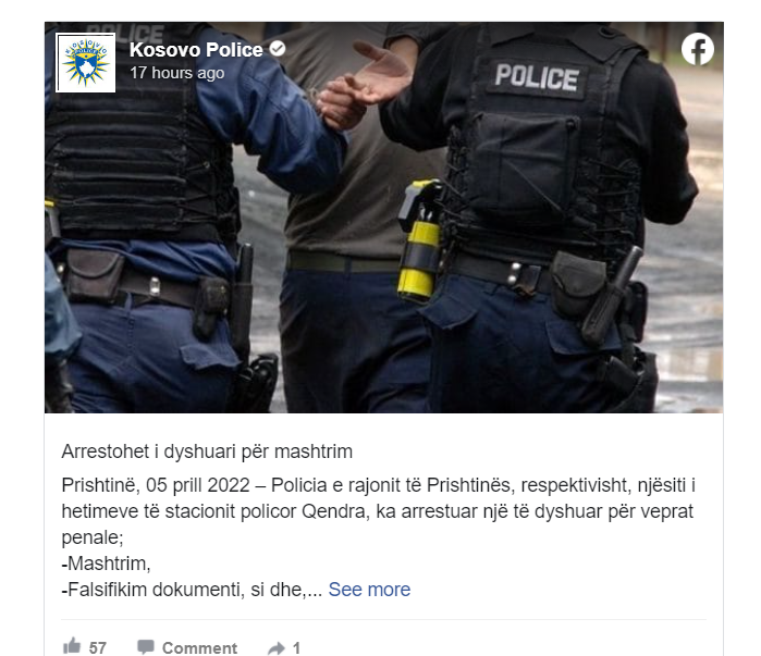 Policia e rajonit të Prishtinës, respektivisht, njësiti i hetimeve të stacionit policor Qendra, ka arrestuar një të dyshuar për veprat penale; -mashtrim, -falsifikim dokumenti, si dhe -legalizim i përmbajtjes së rreme.