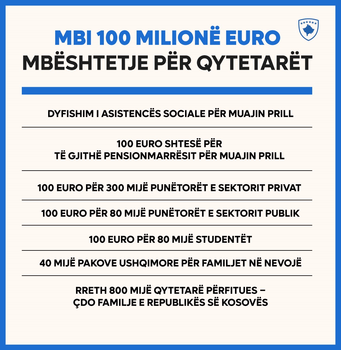 Këto masa mbështetëse përfshijnë: dyfishim të asistencës sociale për muajin prill, 100 euro shtesë për të gjithë pensionmarrësit për muajin prill, 100 euro për 300 mijë punëtorët e sektorit privat, 100 euro për 80 mijë punëtoret e sektorit publik, 100 euro për 80 mijë studentët.
