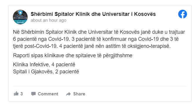 Në Shërbimin Spitalor Klinik dhe Universitar të Kosovës janë duke u trajtuar 6 pacientë nga Covid-19. 3 pacientë të konfirmuar nga Covid-19 dhe 3 të tjerë post-Covid-19. 4 pacientë janë nën astitim të oksigjeno-terapisë.