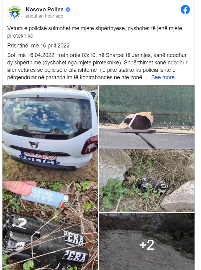 Nga shikimi i vendit të ngjarjes është vërejtur se në xhamin e veturës policore ka mbetur një copë letre (dyshohet mbështjellës i mjeteve piroteknike). Ngjarja ka ndodhur në një pjesë që është afër territorit të Serbisë dhe dyshimi i bazuar është se këto mjete janë hedhur nga territori i Serbisë. Policia ka qenë duke monitoruar një rrugë ilegale të mbyllur kohë më parë dhe e cila përdorej për kontrabandë të mallrave.