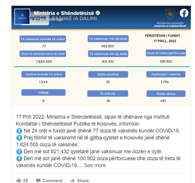 Instituti Kombëtar i Shëndetësisë së Kosovës përmes postimit në rrjetin social Facebook, ka publikuar rastet e të infektuarve me COVID-19, më 17.04.2022.