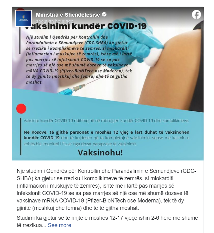 Ministria e Shëndetësisë ka bërë të ditur se një studim i Qendrës për Kontrollin dhe Parandalimin e Sëmundjeve (CDC-SHBA) ka gjetur se rreziku i komplikimeve të zemrës, si miokarditi (inflamacion i muskujve të zemrës), ishte më i lartë pas marrjes së infeksionit COVID-19 se sa pas marrjes së një ose më shumë dozave të vaksinave mRNA COVID-19 (Pfizer-BioNTech ose Moderna), tek të dy gjinitë (meshkuj dhe femra) dhe te të gjitha moshat.