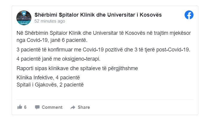 Në Shërbimin Spitalor Klinik dhe Universitar të Kosovës në trajtim mjekësor nga Covid-19, janë 6 pacientë.