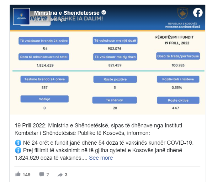Instituti Kombëtar i Shëndetësisë së Kosovës përmes postimit në rrjetin social Facebook, ka publikuar rastet e të infektuarve me COVID-19, më 19.04.2022.