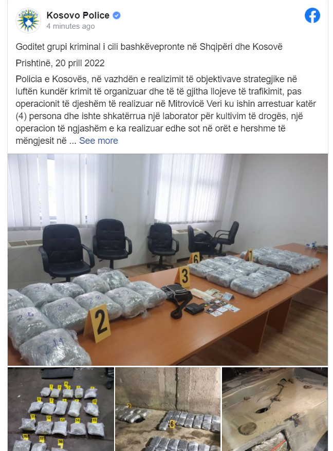 Policia e Kosovës mbetet e përkushtuar në luftimin e grupeve kriminale pa dallim dhe parandalimin e krimit të të gjitha llojeve, në veçanti luftë e pa kompromis do të bëhet ndaj abuzuesve dhe trafikantëve me substanca narkotike, thuhet në postimin në Facebook të PK-së.