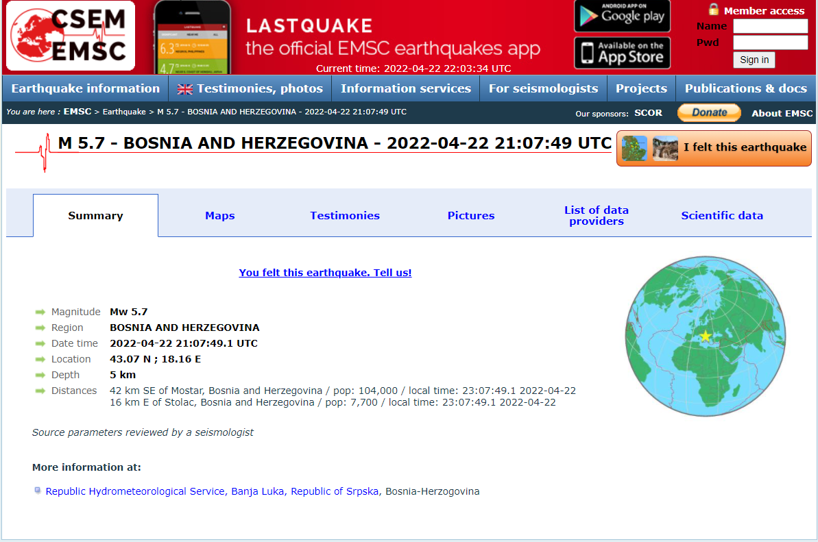 Qendra Sizmiologjike Euromesdhetare ka raportuar se të premten tërmeti ka goditur Bosnjën dhe Hercegovinën ku është ndier edhe në tërë rajonin, në Shqipëri, Kroaci, Mal të Zi dhe Kosovë.
