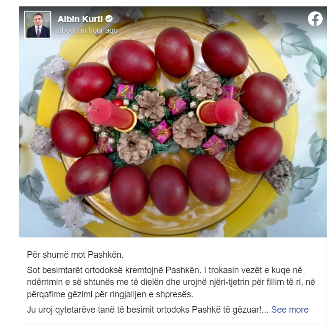 Kurti në postimin e tij në Facebook ka thënë se këtë pranverë, në këtë kremtim, urojmë që shpresa dhe jeta të triumfojë mbi gjithçka, që ndihma ta mbizotërojë egoizmin, që e drejta ta largojë të keqen, së bashku dhe me vullnetin dhe përpjekjen e të gjithëve.