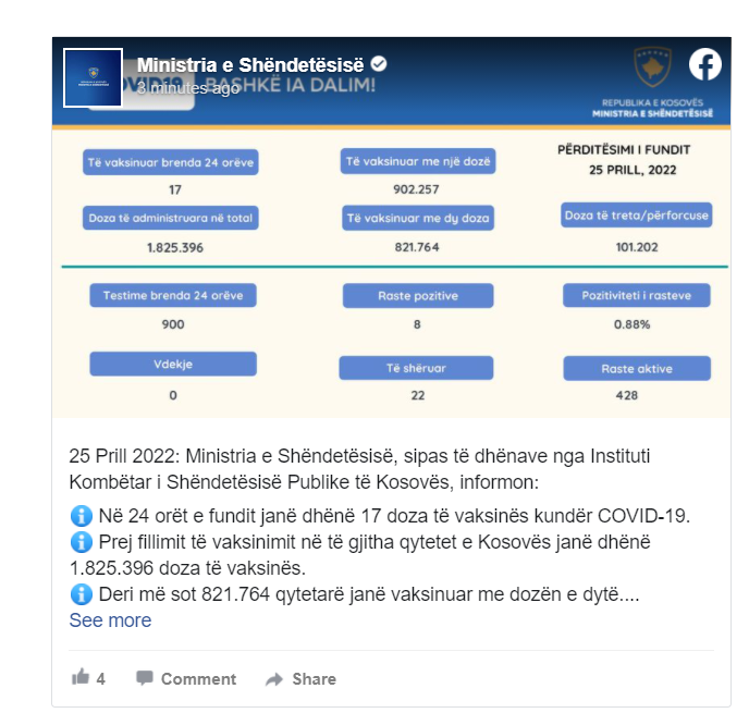 Instituti Kombëtar i Shëndetësisë së Kosovës përmes postimit në rrjetin social Facebook, ka publikuar rastet e të infektuarve me COVID-19, më 25.04.2022.