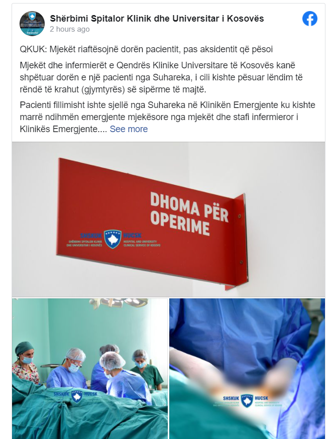 Mjekët dhe infermierët e Qendrës Klinike Universitare të Kosovës kanë shpëtuar dorën e një pacienti nga Suhareka, i cili kishte pësuar lëndim të rëndë të krahut (gjymtyrës) së sipërme të majtë.