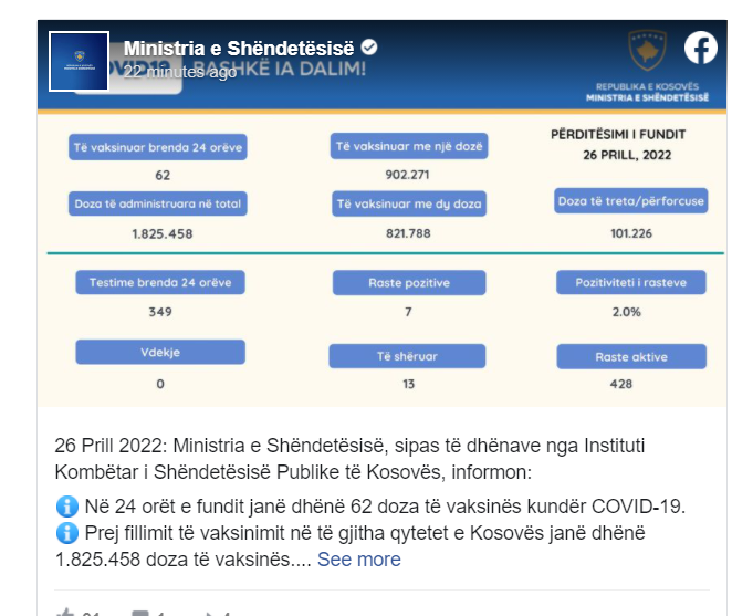 Instituti Kombëtar i Shëndetësisë së Kosovës përmes postimit në rrjetin social Facebook, ka publikuar rastet e të infektuarve me COVID-19, më 26.04.2022.