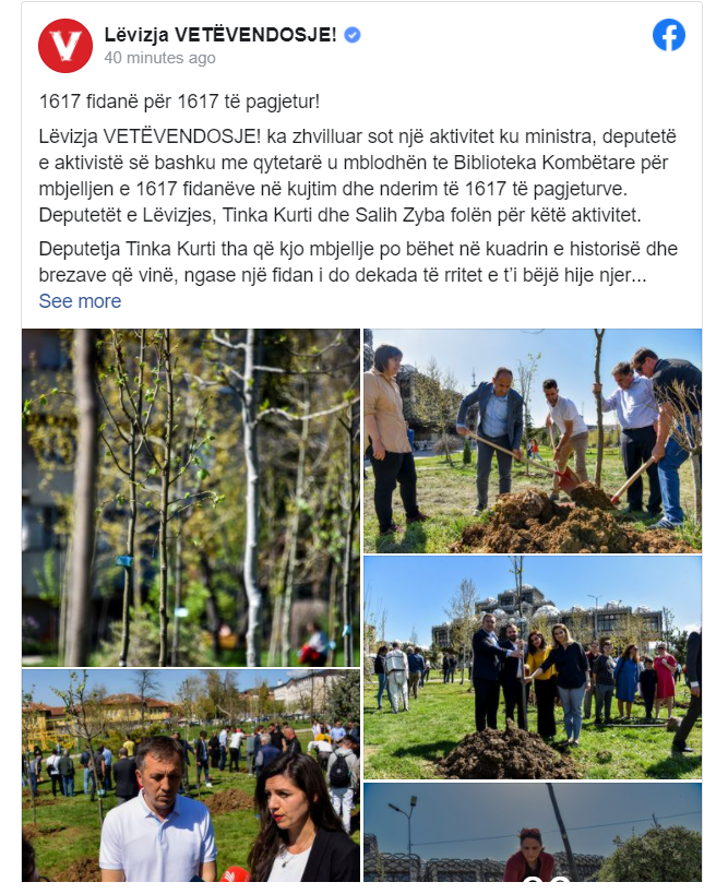 Lëvizja Vetëvendosje ka zhvilluar sot një aktivitet ku ministra, deputetë e aktivistë së bashku me qytetarë u mblodhën te Biblioteka Kombëtare për mbjelljen e 1617 fidanëve në kujtim dhe nderim të 1617 të pagjeturve. Deputetët e Lëvizjes, Tinka Kurti dhe Salih Zyba folën për këtë aktivitet.