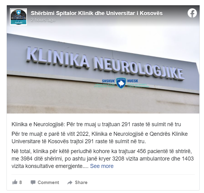 Stafi i klinikës ka kryer 917 EEG dhe 494 EMNG, 39 raste me Sklerozë Multiple, 650 raste të epilepsisë, 68 raste neuro-psikologjike dhe shumë shërbime të tjera mjekësore neurologjike për pacientë të spitalizuar dhe ata ambulantor, thuhet në postimin në Facebook të ShSKUK-së.