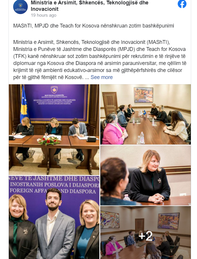 Ministria e Arsimit, Shkencës, Teknologjisë dhe Inovacionit (MAShTI), Ministria e Punëve të Jashtme dhe Diasporës (MPJD) dhe Teach for Kosova (TFK) kanë nënshkruar sot zotim bashkëpunimi për rekrutimin e të rinjëve të diplomuar nga Kosova dhe Diaspora në arsimin parauniversitar, me qëllim të krijimit të një ambienti edukativo-arsimor sa më gjithëpërfshirës dhe cilësor për të gjithë fëmijët në Kosovë.