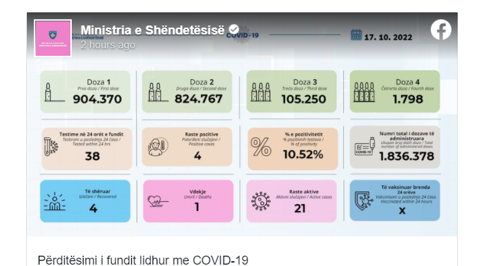 Instituti Kombëtar i Shëndetësisë së Kosovës përmes postimit në rrjetin social Facebook, ka publikuar rastet e të infektuarve me COVID-19, më 17.10.2022.