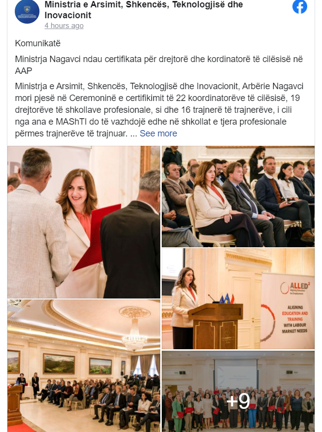 Ministrja e Arsimit, Shkencës, Teknologjisë dhe Inovacionit, Arbërie Nagavci mori pjesë në Ceremoninë e certifikimit të 22 koordinatorëve të cilësisë, 19 drejtorëve të shkollave profesionale, si dhe 16 trajnerë të trajnerëve, i cili nga ana e MAShTI do të vazhdojë edhe në shkollat e tjera profesionale përmes trajnerëve të trajnuar.