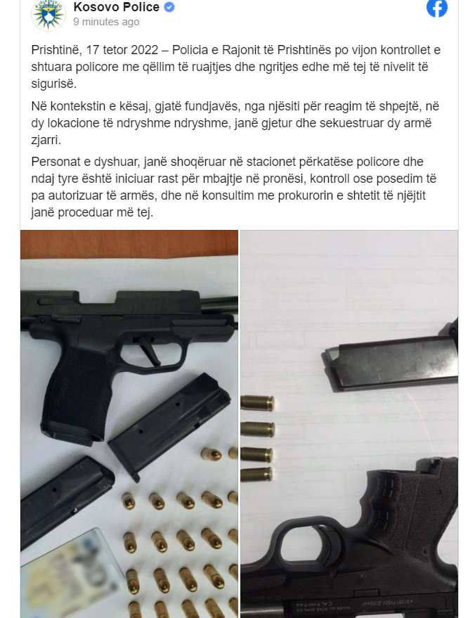 Personat e dyshuar, janë shoqëruar në stacionet përkatëse policore dhe ndaj tyre është iniciuar rast për mbajtje në pronësi, kontroll ose posedim të pa autorizuar të armës, dhe në konsultim me prokurorin e shtetit të njëjtit janë proceduar më tej, thuhet në postimin në Facebook të PK-së.