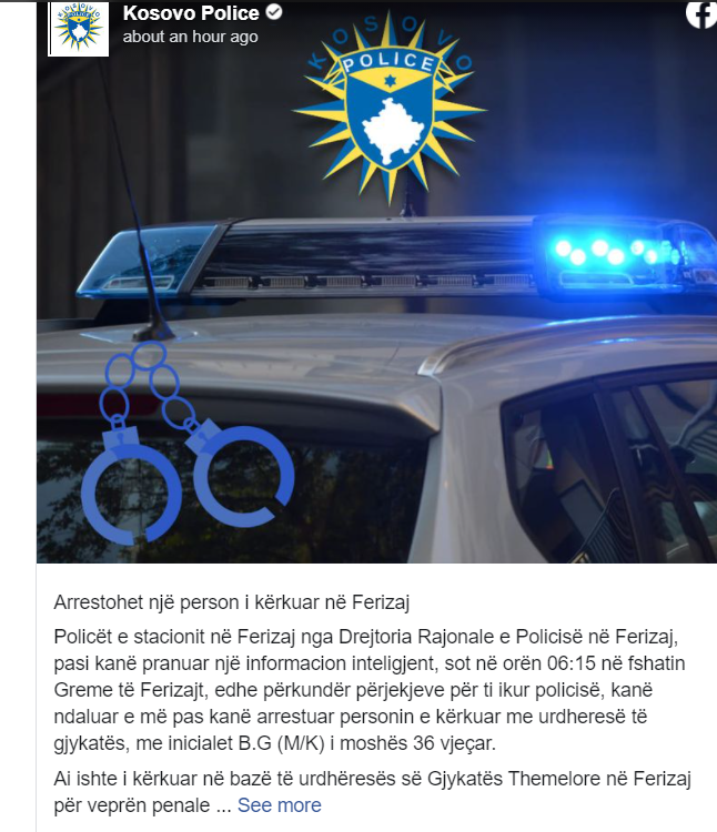 Policët e stacionit në Ferizaj nga Drejtoria Rajonale e Policisë në Ferizaj, pasi kanë pranuar një informacion inteligjent, sot në orën 06:15 në fshatin Greme të Ferizajt, edhe përkundër përjekjeve për t’i ikur policisë, kanë ndaluar e më pas kanë arrestuar personin e kërkuar me urdheresë të gjykatës, me inicialet B.G (M/K) i moshës 36 vjeçar.