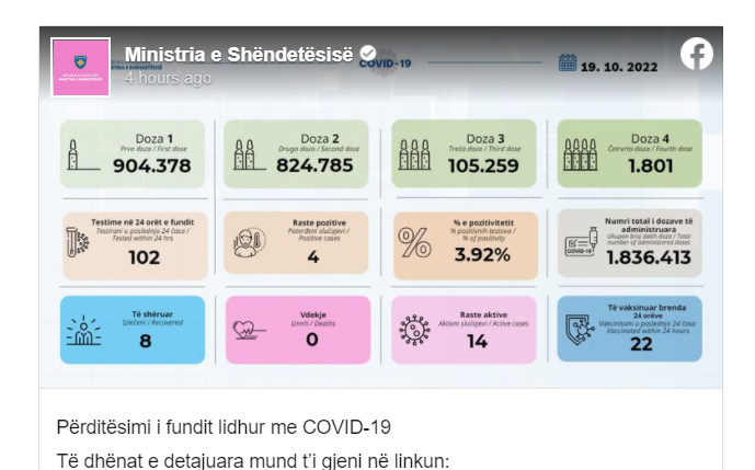 Instituti Kombëtar i Shëndetësisë së Kosovës përmes postimit në rrjetin social Facebook, ka publikuar rastet e të infektuarve me COVID-19, më 19.10.2022.