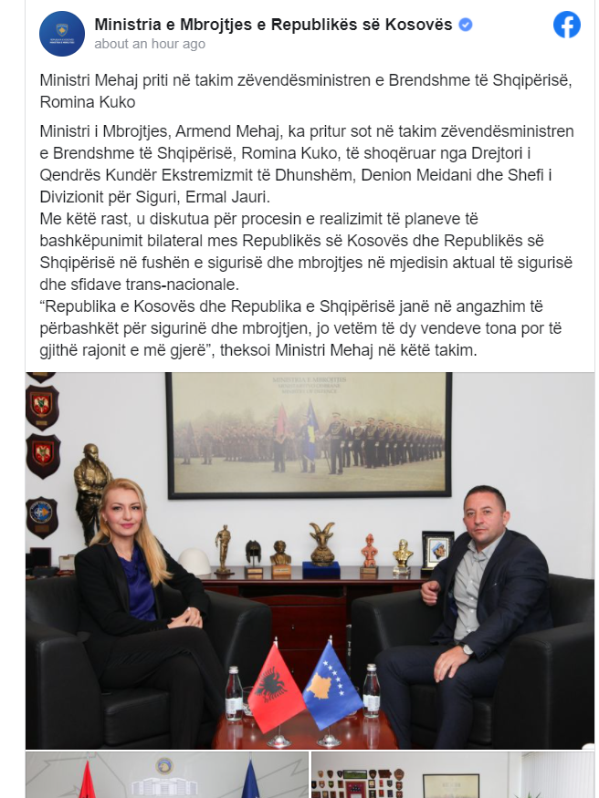 “Republika e Kosovës dhe Republika e Shqipërisë janë në angazhim të përbashkët për sigurinë dhe mbrojtjen, jo vetëm të dy vendeve tona por të gjithë rajonit e më gjerë”, theksoi ministri Mehaj në këtë takim.