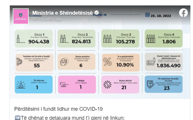 Instituti Kombëtar i Shëndetësisë së Kosovës përmes postimit në rrjetin social Facebook, ka publikuar rastet e të infektuarve me COVID-19, më 25.10.2022.