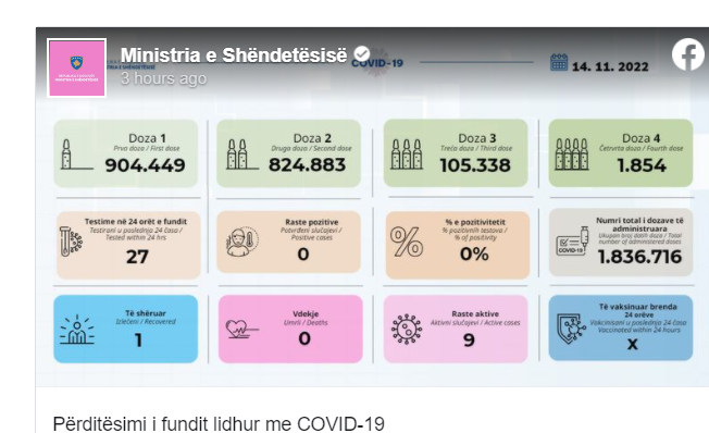 Instituti Kombëtar i Shëndetësisë së Kosovës përmes postimit në rrjetin social Facebook, ka publikuar rastet e të infektuarve me COVID-19, më 14.11.2022.