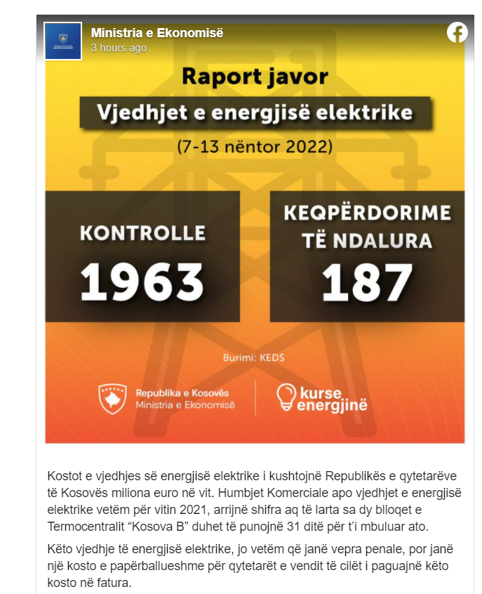 Ministria e Ekonomisë është në komunikim të vazhdueshëm me institucionet përgjegjëse të furnizimit të cilët janë duke organizuar aksione të vazhdueshme me institucionet e rendit për t’i ndalur vjedhjet e energjisë elektrike.