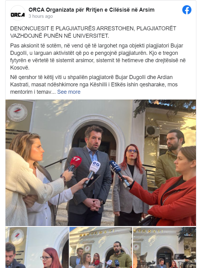 Organizata për rritjen e e Cilësië në Arsim -ORCA, njofton se pas aksionit të sotëm, në vend që të largohet nga objekti plagjiatori Bujar Dugolli, u larguan aktivistët që po e pengojnë plagjiaturën. Kjo e tregon fytyrën e vërtetë të sistemit arsimor, sistemit të hetimeve dhe drejtësisë në Kosovë