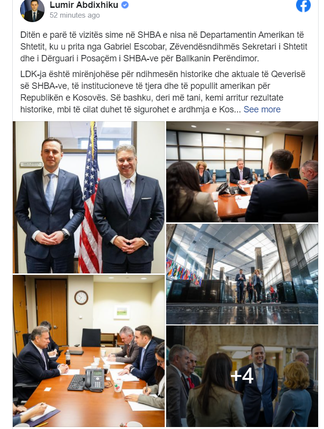 Kryetari i Lidhjes Demokratike të Kosovës, Lumir Abdixhiku ditën e parë të vizitës në SHBA e ka nis në Departamentin Amerikan të Shtetit, ku u prit nga Gabriel Escobar, zëvendës/ndihmës Sekretari i Shtetit dhe i Dërguari i Posaçëm i SHBA-ve për Ballkanin Perëndimor.
