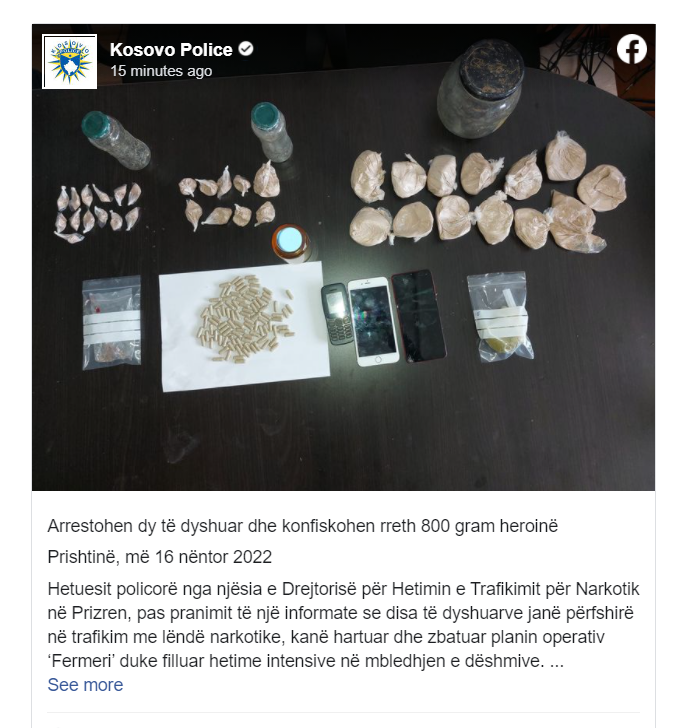 Sot, më 16.11.2022 në ora 06:10, në fshatin Shpenadi të Prizrenit, ka filluar kontrolli dhe gjatë realizimit të tij janë gjetur dhe sekuestruar: 805.5 gr substancë dyshohet të jetë heroinë, 1.1 gr. marihuanë dhe dëshmi tjera relevante për rastin.