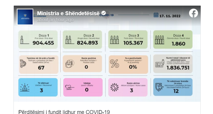 Instituti Kombëtar i Shëndetësisë së Kosovës përmes postimit në rrjetin social Facebook, ka publikuar rastet e të infektuarve me COVID-19, më 17.11.2022.