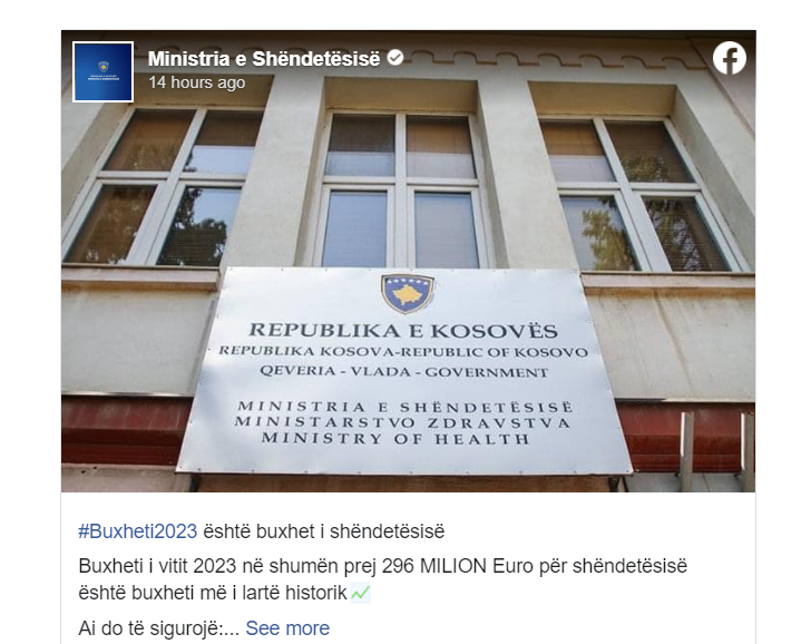 Ministria e Shëndetësisë ka njoftuar se buxheti i vitit 2023 në shumën prej 296 milionë euro për shëndetësisë është buxheti më i lartë historik.