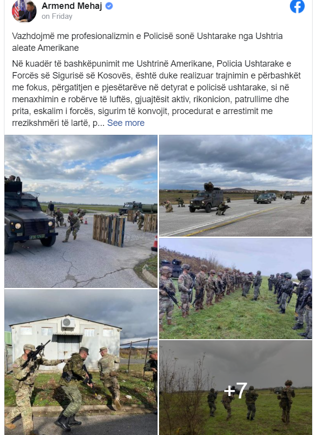 Ministri i Mbrojtjes, Armend Mehaj bën të ditur se në kuadër të bashkëpunimit me Ushtrinë Amerikane, Policia Ushtarake e Forcës së Sigurisë së Kosovës, është duke realizuar trajnimin e përbashkët me fokus, përgatitjen e pjesëtarëve në detyrat e policisë ushtarake, si në menaxhimin e robërve të luftës, gjuajtësit aktiv, rikonicion, patrullime dhe prita, eskalim i forcës, sigurim të konvojit, procedurat e arrestimit me rrezikshmëri të lartë, pika të kontrollit, si dhe bllokim të rrugëve.