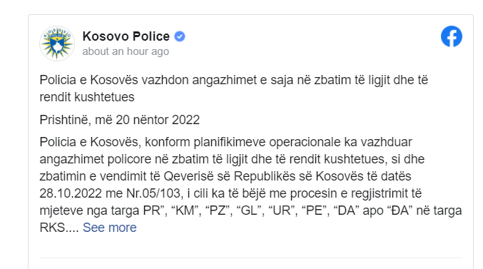 Policia e Kosovës, konform planifikimeve operacionale ka vazhduar angazhimet policore në zbatim të ligjit dhe të rendit kushtetues, si dhe zbatimin e vendimit të Qeverisë së Republikës së Kosovës të datës 28.10.2022 me Nr.05/103, i cili ka të bëjë me procesin e regjistrimit të mjeteve nga targa PR”, “KM”, “PZ”, “GL”, “UR”, “PE”, “DA” apo “ĐA” në targa RKS.