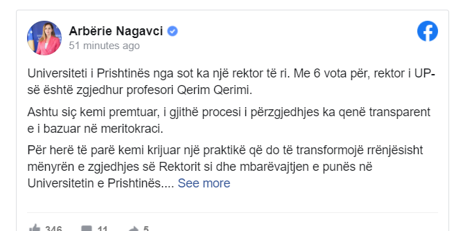 Nagavci në postimin e saj në Facebook ka thënë se UP e meriton të shndërrohet në mjedis akademik ku mbizotëron cilësia intelektuale ashtu siç e meriton ky institucion me rëndësi jetike për vendin tonë. Ashtu siç kemi premtuar, i gjithë procesi i përzgjedhjes ka qenë transparent e i bazuar në meritokraci.